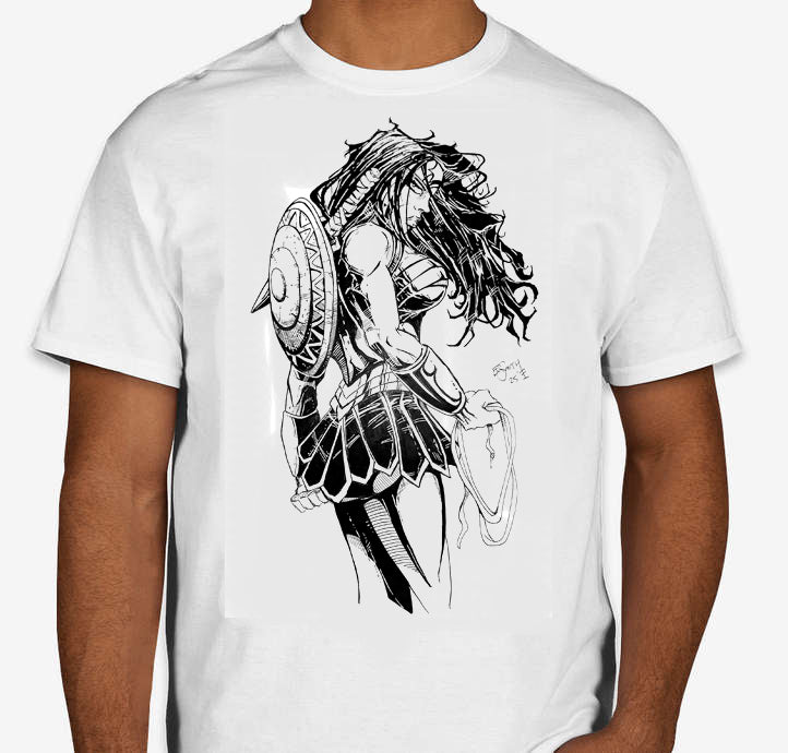 ONLY 25 WILL BE MADE! This is a handmade T-shirt of this Wonder Woman Drawing. Comes in White and sizes range from Small to XL. Short Sleeve.
